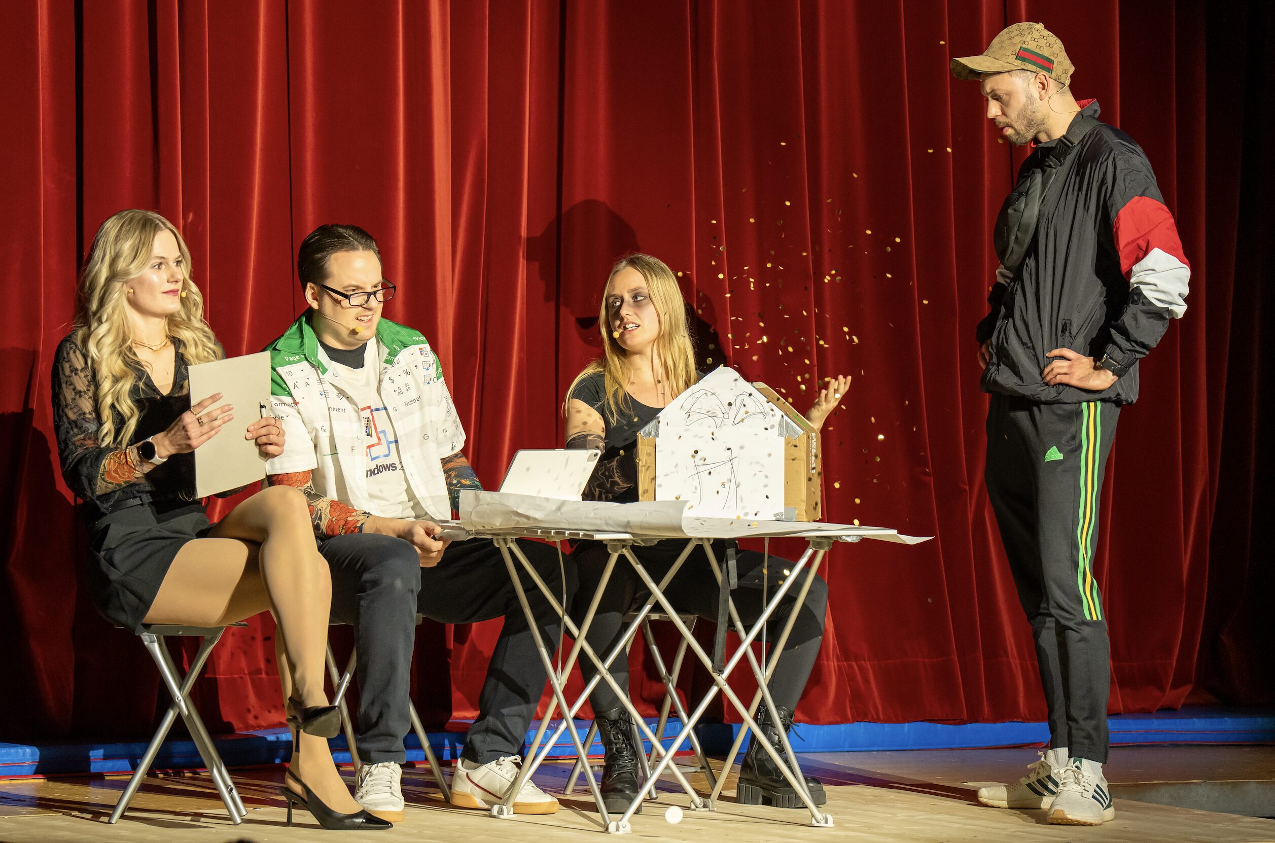 Zwischen den turnerischen Darbietungen sorgte ein engagiertes Sketch-Team für humorvolle Unterhaltung. In einer kriminalistisch angehauchten Geschichte ging es um die Suche nach einem neuen Konzept für das kommende Turnfest 2026 in Islikon. Ein Konzept, das nicht einfach gefunden, sondern «gestohlen» werden sollte. Eine schillernde Figur zog im Hintergrund die Fäden und stellte ein ganzes Team an Helfern zusammen. Kurze Videoeinspielungen auf einer Leinwand ergänzten die Szenen auf der Bühne.
